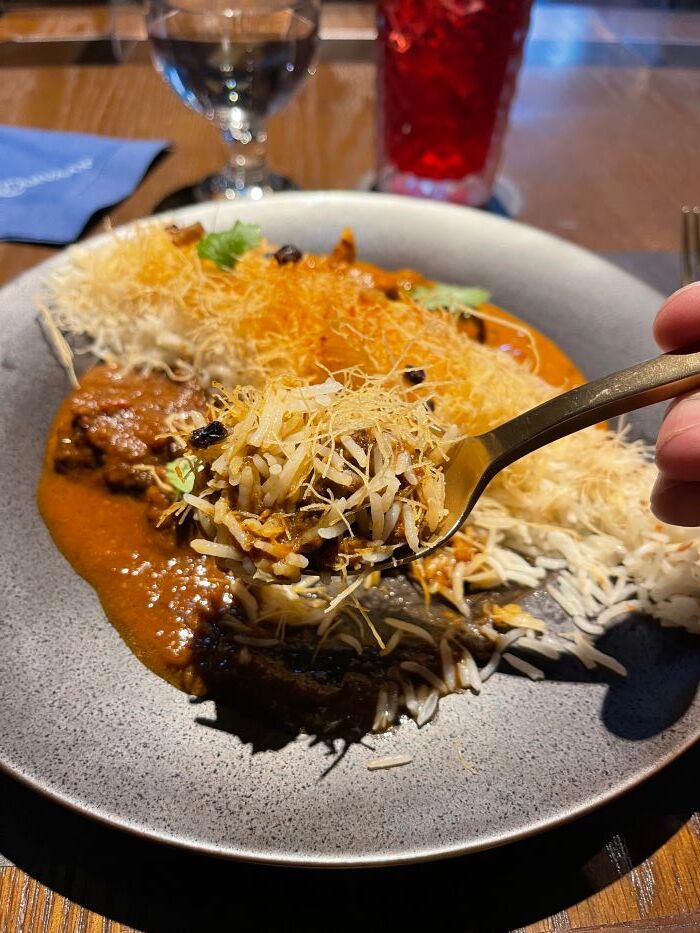 要はチキンカレーなんですが、どこともいえないスパイスの配合とバスマティライスの相性がよく、ベビースターラーメンのようなパスタもパリパリと小気味いいです。