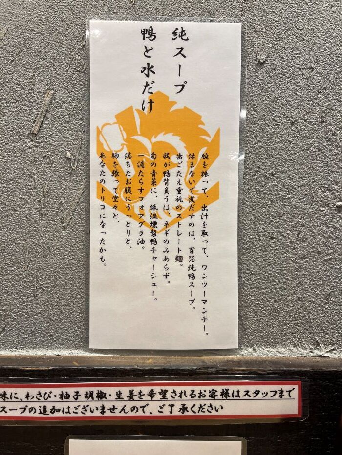 100%鴨出汁のラーメンということで錦糸町や本郷三丁目などにあるチェーン店のようですね。