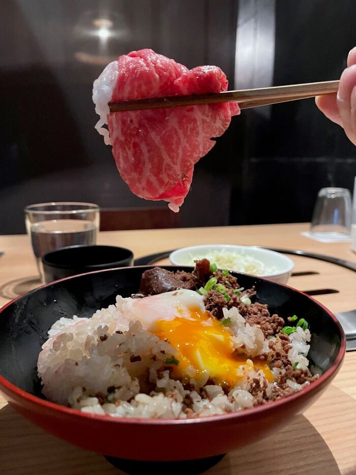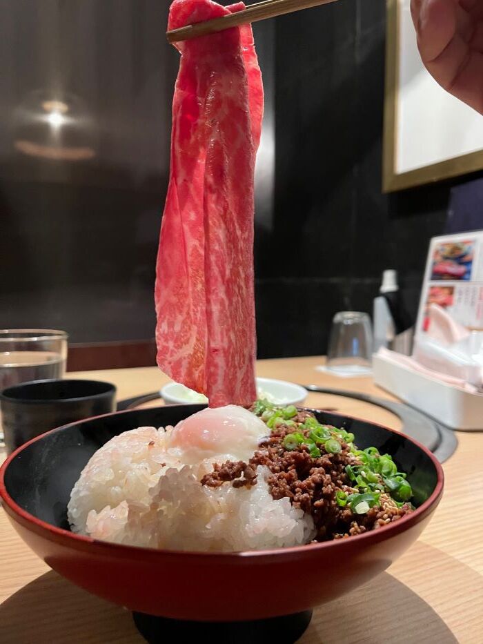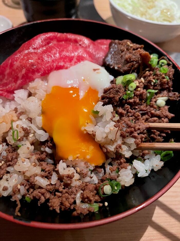 なんのことはない、牛肉そぼろ丼に一枚生肉をのせただけなんですが・・