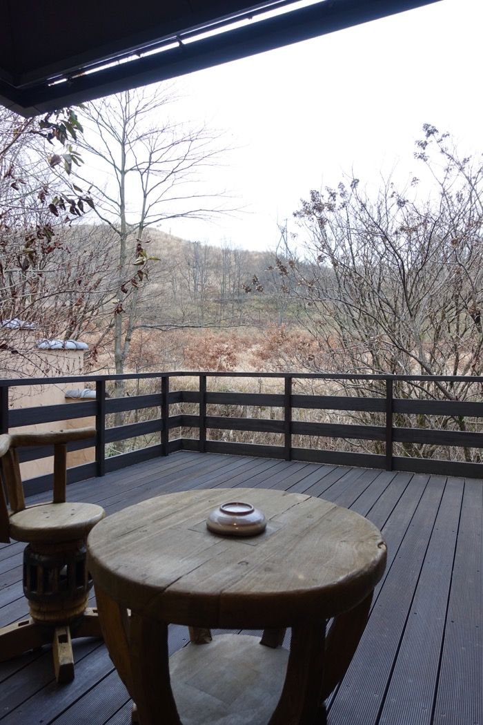木々の隙間から紅葉を終え冬を迎える山を望みます。