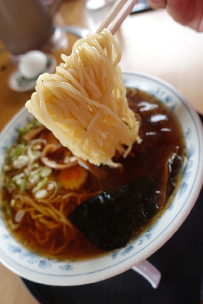 澄み切った醤油ラーメンに細めの縮れ麺。